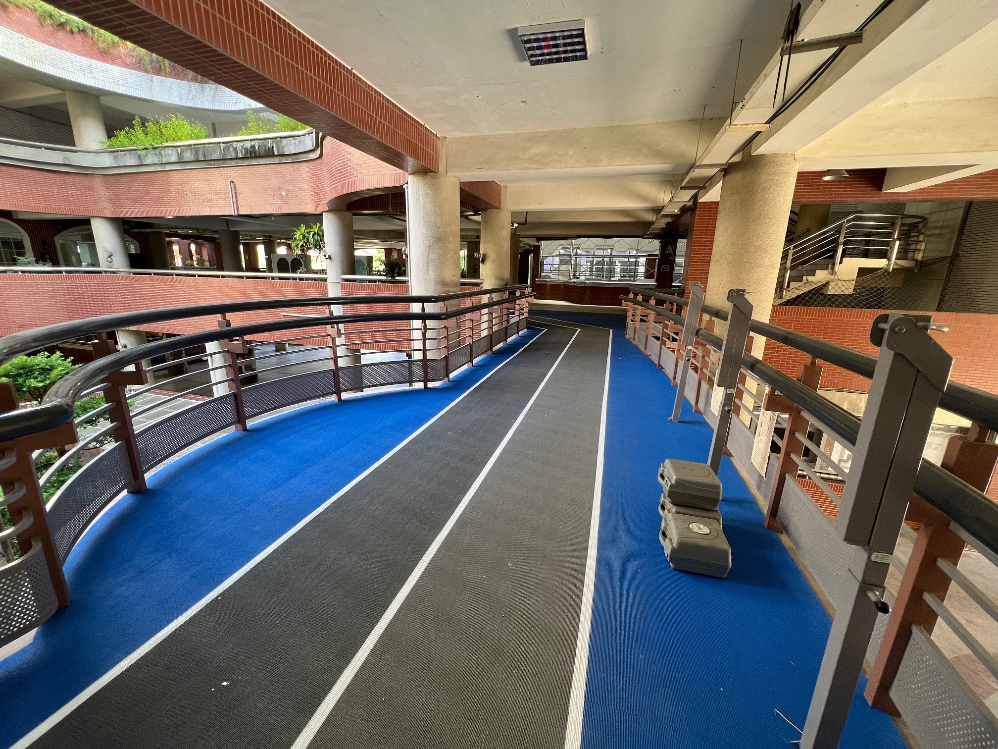 本案為台北市轄內國民中學唯一設有室內跑道的學校,位於本校二樓廊道,全長約140公尺兩道跑道,材質選用國際田徑總會認證廠牌(OSST SPORT)所生產的產品,安全、無毒、環保及富有彈性的合成橡膠材質。