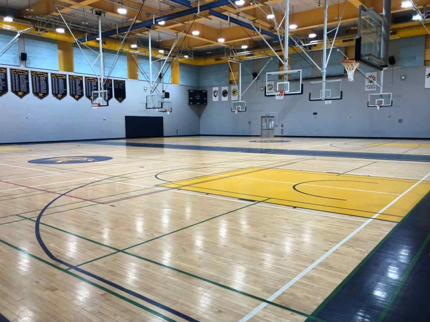 本案位於台國際學校,選用國際籃球總會(FIBA)認證產品,由美國BISON製造,品質優良穩定。懸吊式籃球架可前收、後收、側收,將場地使用效益發揮其最大化。