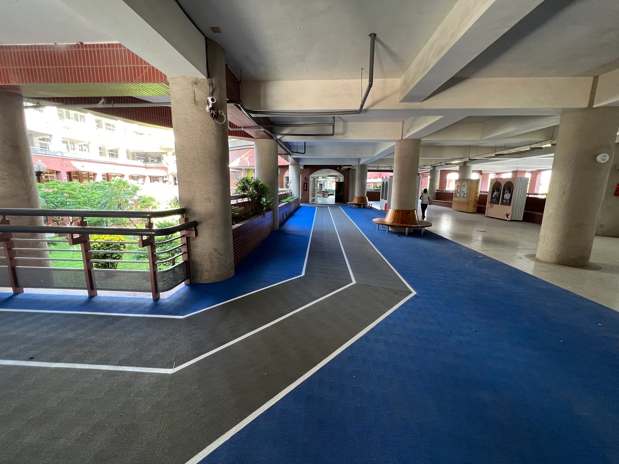 本案為台北市轄內國民中學唯一設有室內跑道的學校,位於本校二樓廊道,全長約140公尺兩道跑道,材質選用國際田徑總會認證廠牌(OSST SPORT)所生產的產品,安全、無毒、環保及富有彈性的合成橡膠材質。